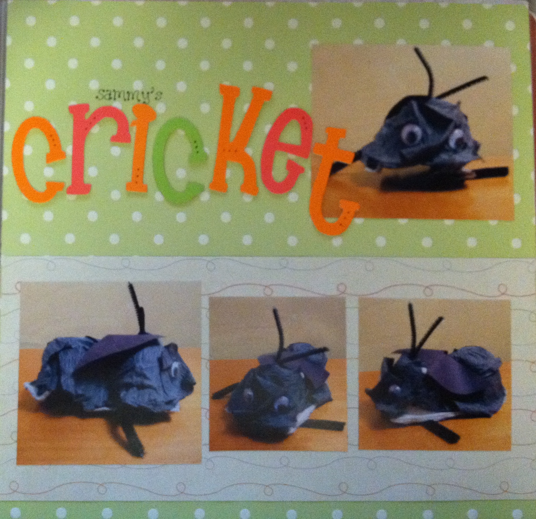 Just before he passed away, we had begun the early discussions about the possible options available to him. We had hoped that his preschool teacher might also be his kindergarten teacher because she is such a great teacher. Last year, the children in Sammy’s class found a cricket in the classroom, and because they were interested in crickets, his teacher incorporated a cricket theme into their weekly lesson. They learned about crickets–where they live, what they eat, how they make their sounds–and they made their own cricket representations using tissue paper, pipe cleaners, and egg cartons. One little cricket managed to find its way into the classroom, and because his teacher was inspired, Sammy learned all about him.
