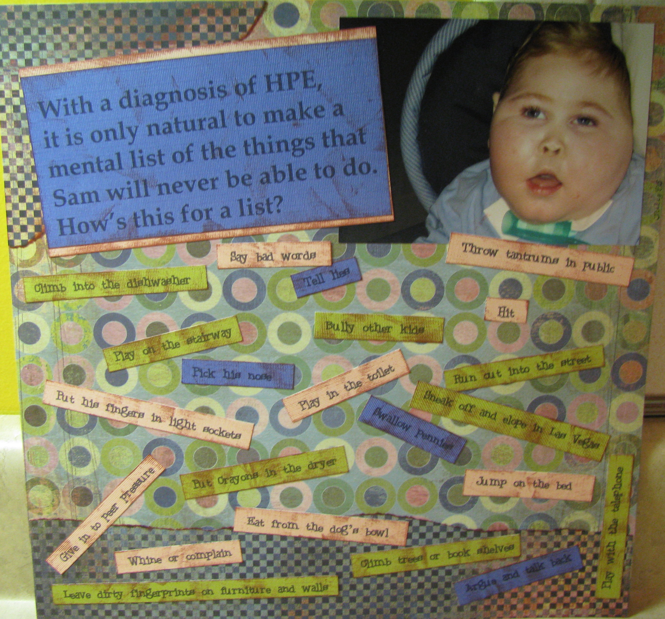 I had done my homework, and I knew very well all of the many things that Sammy would never be able to do. Being somewhat sarcastic at times, I decided one day to make a list of the things that Sammy would never be able to do compared to other “typical” children. Here are a few of my favorites that I incorporated into a scrapbook page:
